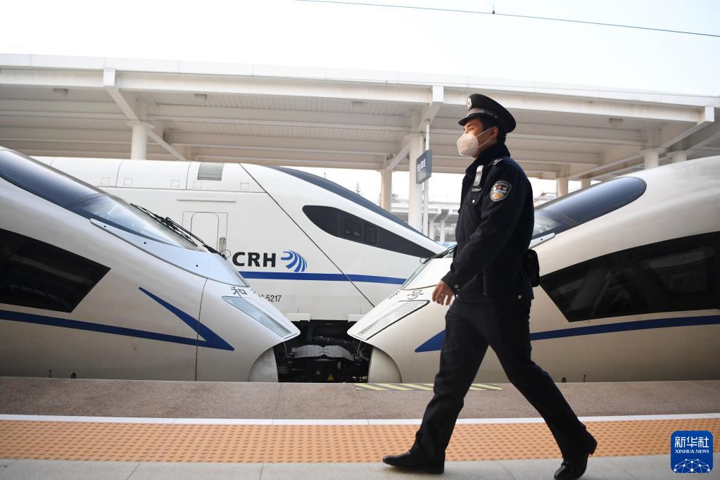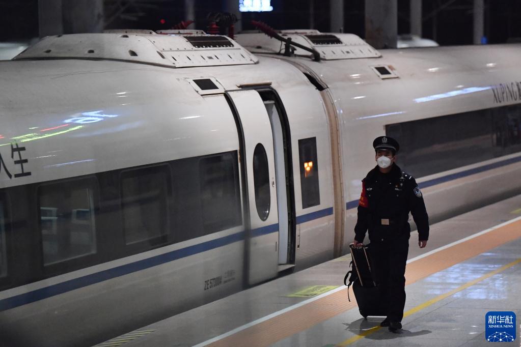 1月9日,白旭伟从G2686次动车组列车旁走过。新华社记者 陈斌 摄