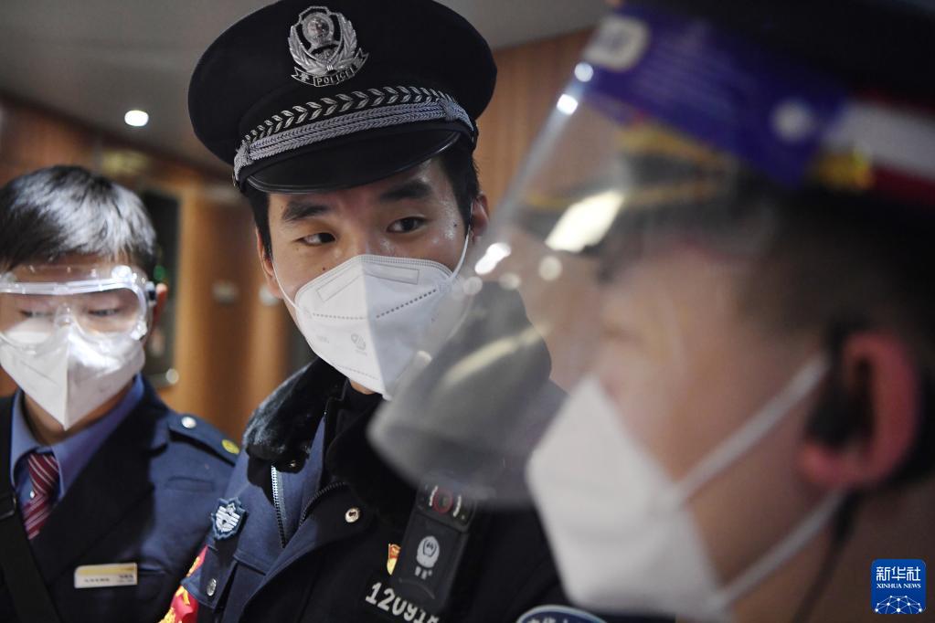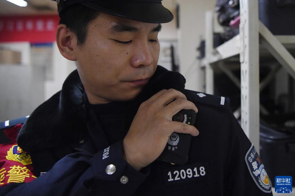 1月9日,白旭伟在值乘前检查佩戴执法记录仪。新华社记者 陈斌 摄