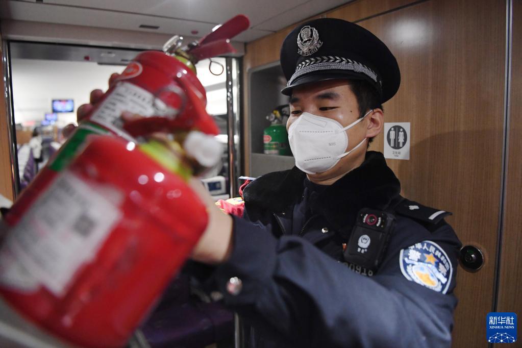 1月9日,白旭伟在G2686次动车组列车上检查消防器材。新华社记者 陈斌 摄