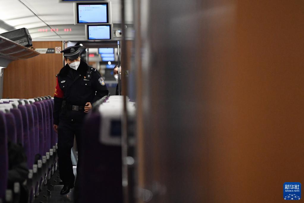 1月9日,白旭伟在G2686次动车组列车车厢内巡查。新华社记者 陈斌 摄