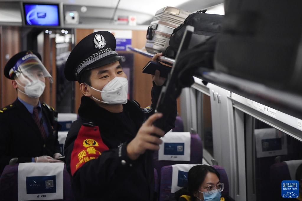1月9日,白旭伟在G2686次动车组列车上对旅客行李进行安全检查。新华社记者 陈斌 摄