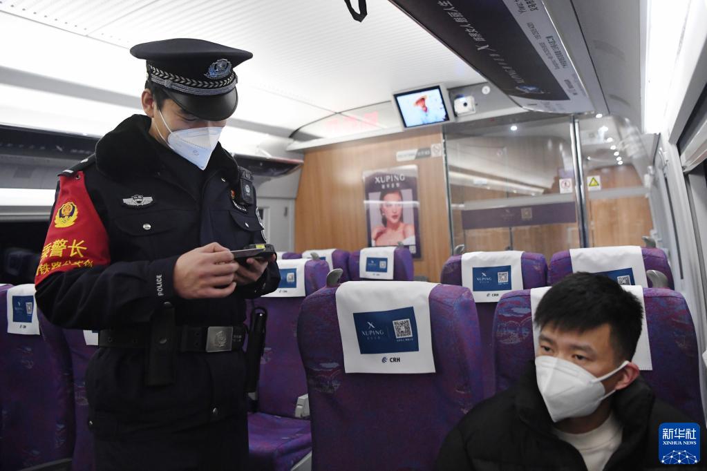 1月9日,白旭伟在G2686次动车组列车上核验旅客身份信息。新华社记者 陈斌 摄