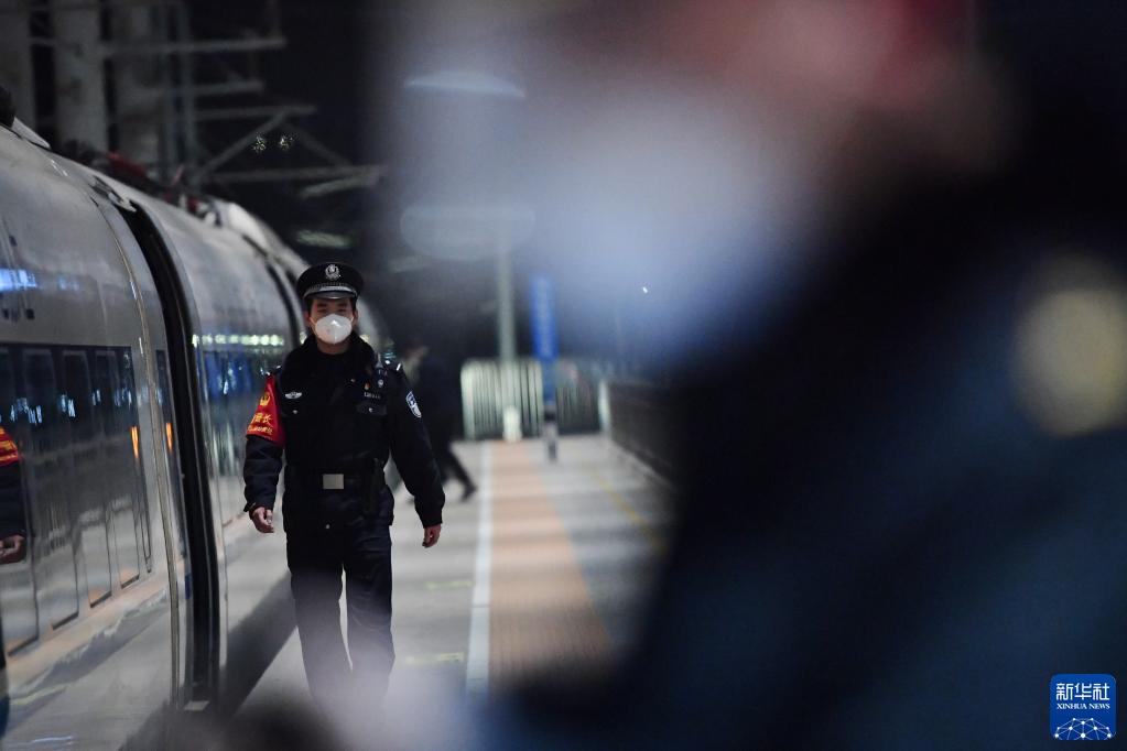 1月9日,在兰州西站,白旭伟在他值乘的G2686次动车组列车旁巡查。新华社记者 陈斌 摄
