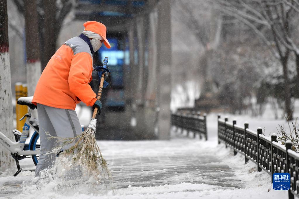 2月8日,环卫人员在兰州黄河风情线景区清扫人行道积雪。新华社记者 陈斌 摄