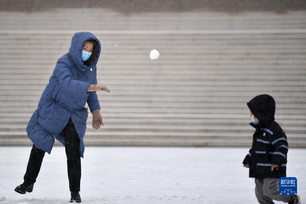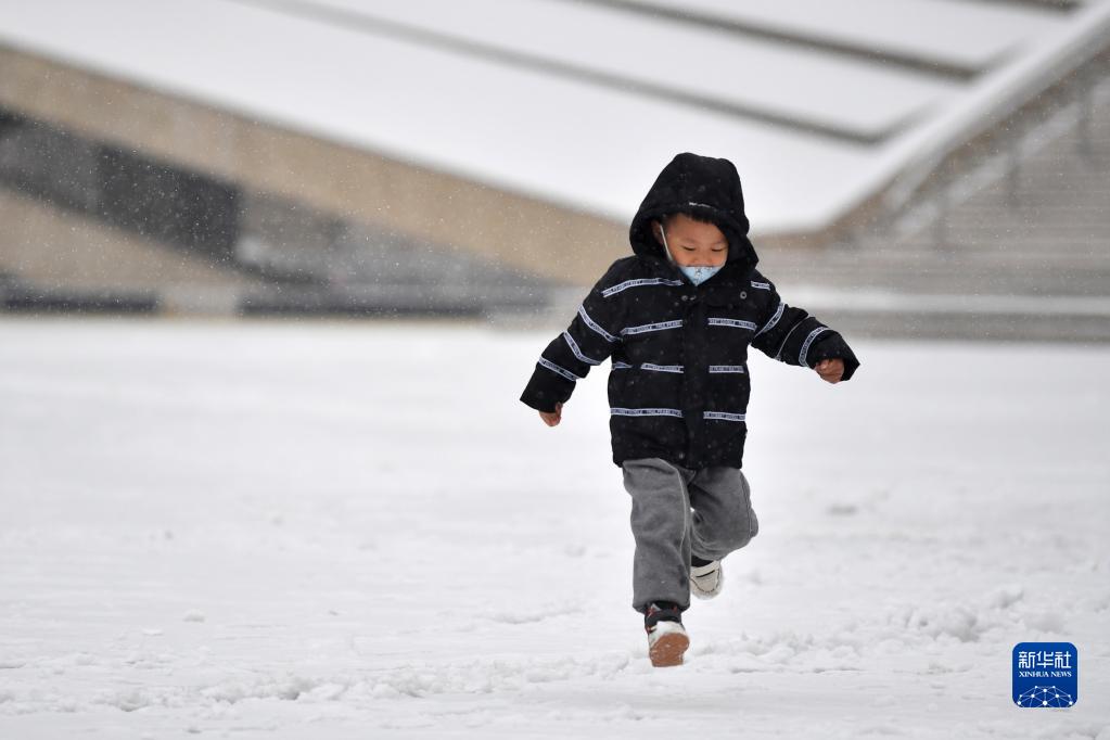 2月8日,一名小朋友在甘肃大剧院门前的雪地里玩耍。新华社记者 陈斌 摄