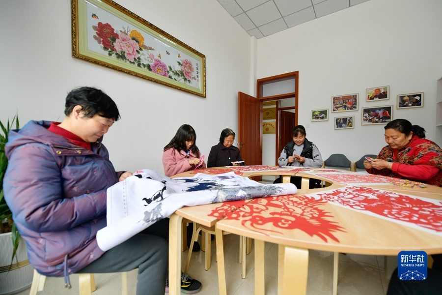 在陇南市徽县虞关乡许坝村“幸福家园”,妇女们在一起做手工(2月11日摄)。新华社记者 范培珅 摄