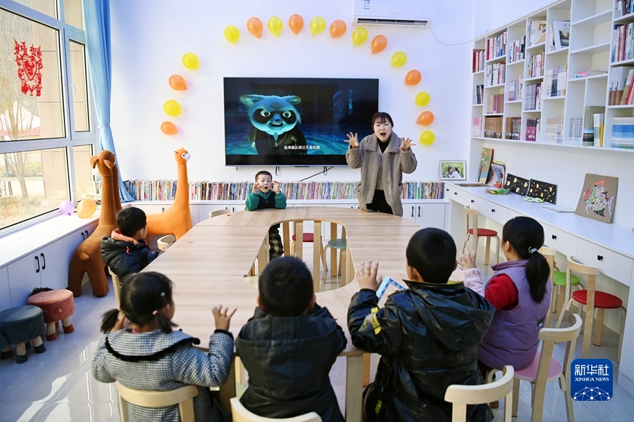 在陇南市徽县虞关乡许坝村“幸福家园”,志愿者带着小朋友唱儿歌(2月11日摄)。新华社记者 范培珅 摄