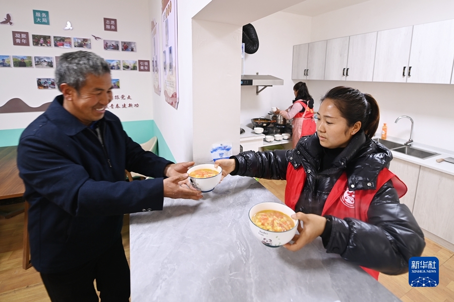 在陇南市宕昌县官亭镇王家村“幸福家园”,村民在食堂打饭(2月8日摄)。新华社记者 范培珅 摄