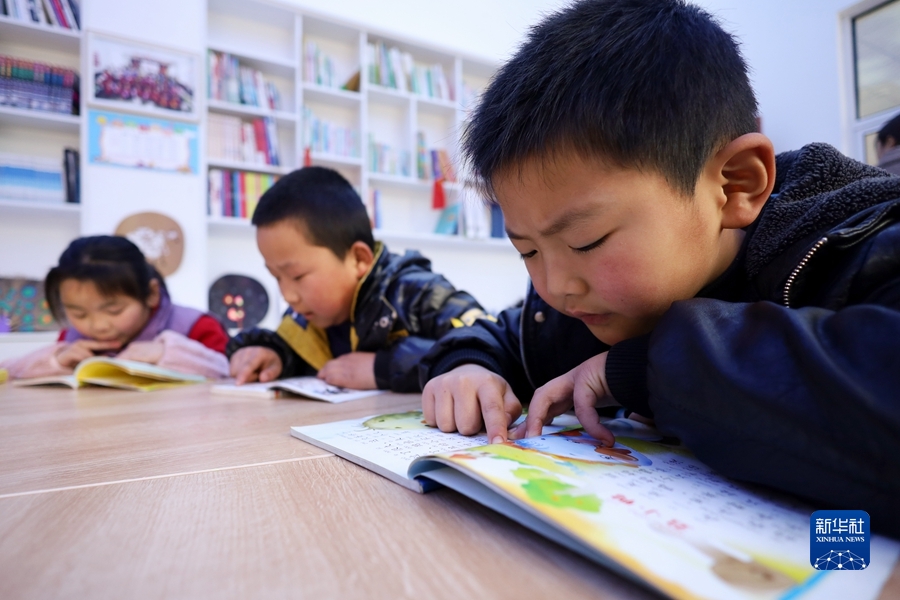 在陇南市徽县虞关乡许坝村“幸福家园”,小朋友在看书(2月11日摄)。新华社记者 马希平 摄