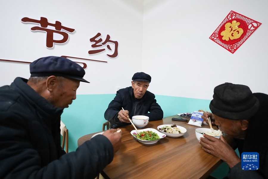 在陇南市宕昌县官亭镇王家村“幸福家园”,村民在食堂吃饭(2月8日摄)。新华社记者 马希平 摄