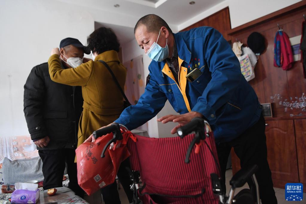 强汉红(右一)上门为一位长期患病的老人收拾轮椅,准备接送老人去医院就医(3月1日摄)。新华社记者 陈斌 摄