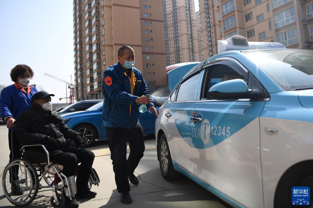 强汉红(右一)在老人上车前给车辆消毒(3月1日摄)。新华社记者 陈斌 摄