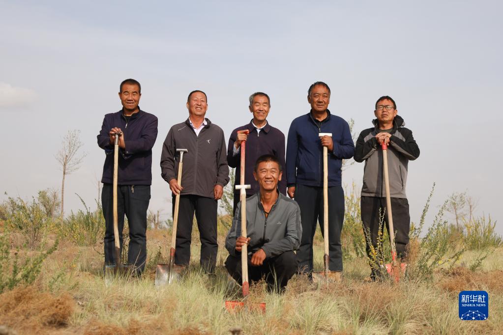 5月6日,八步沙两代治沙人在古浪县的一片治沙区劳作后合影留念。他们从左至右分别为:罗兴全(后左一)、石银山(后左二)、郭万刚(后中)、贺中强(后右二)、程生学(后右一)、郭玺(前)。新华社记者 马希平 摄