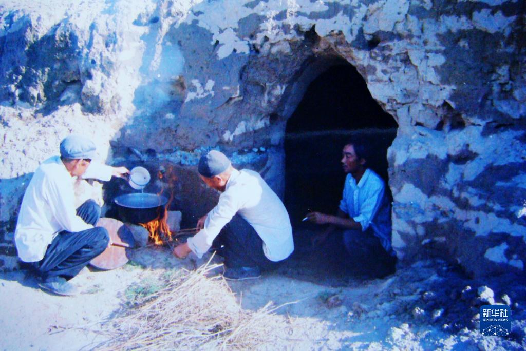 1983年,“六老汉”一代治沙人在“地窝子”生火做饭。新华社发(八步沙林场供图)