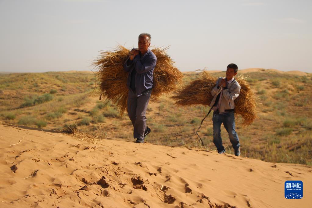 2017年,第二代治沙人贺中强(左)和第三代治沙人郭玺在背草压沙。新华社发(八步沙林场供图)