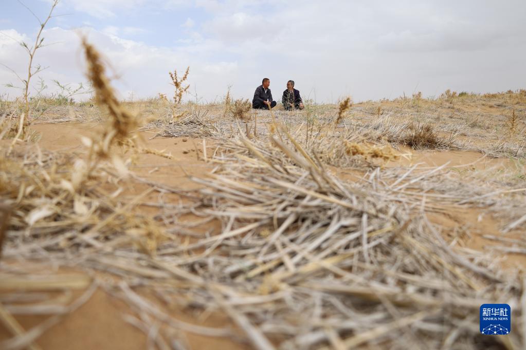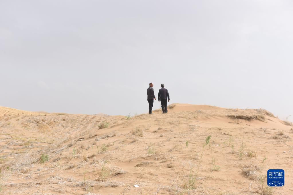 5月6日,八步沙第二代治沙人郭万刚(右)和石银山在古浪县的一片治沙区查看治沙情况。新华社记者 黄晓勇 摄