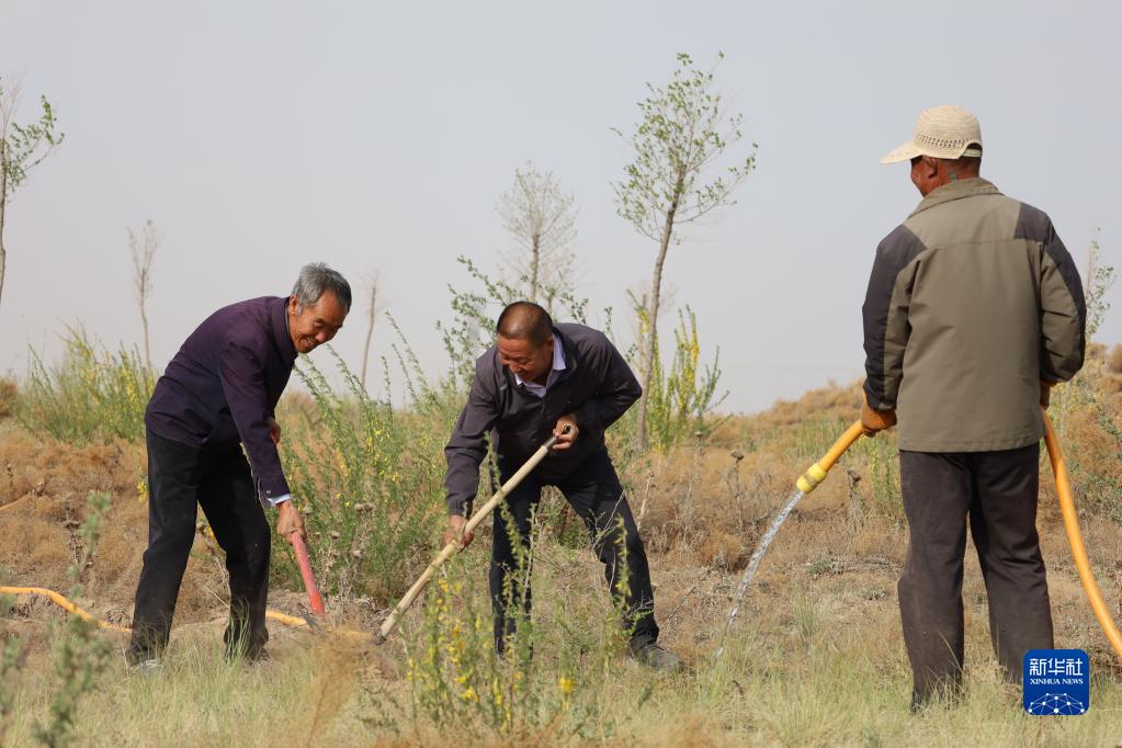 5月6日,第二代治沙人郭万刚(左)和石银山(中)在古浪县的一片治沙区与林场职工一起劳作。新华社记者 马希平 摄