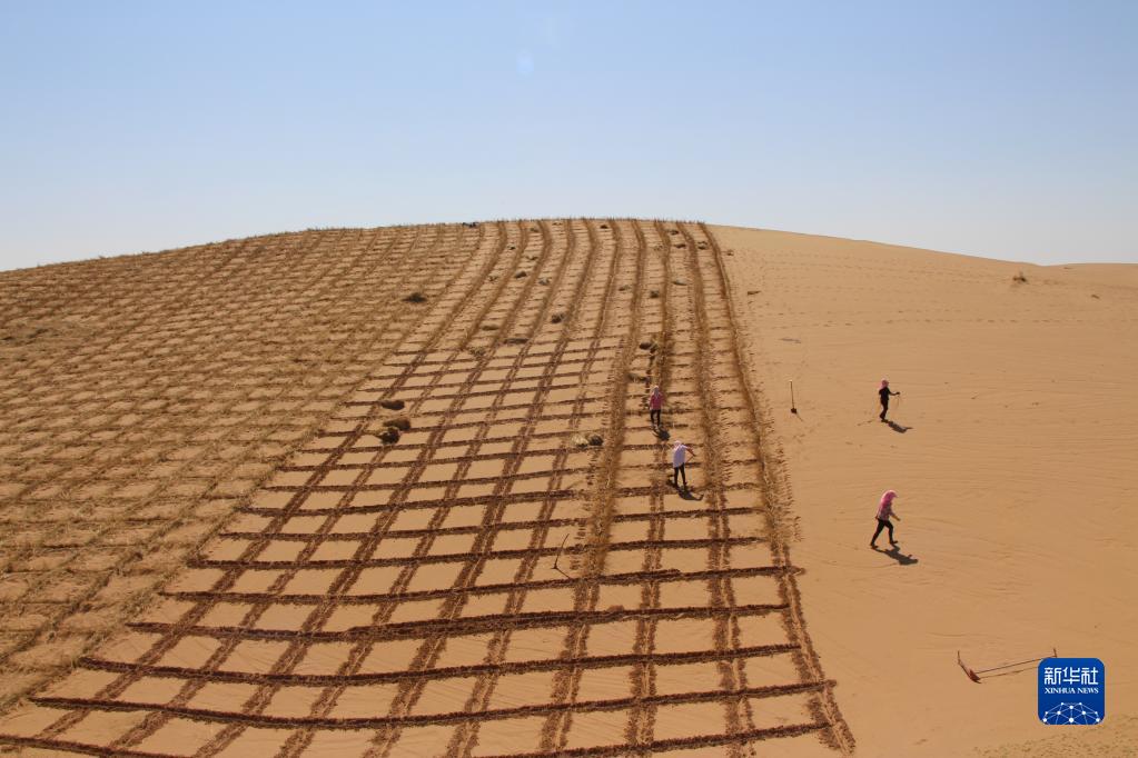 2021年拍摄的八步沙林场职工压沙作业现场。新华社发(八步沙林场供图)