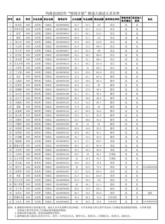 附:玛曲县2022年 “特岗计划”拟进入面试人员名单