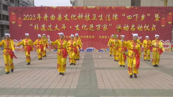 1月17日,2023年舟曲县文化科技卫生法律四下乡暨“非遗过大年,文化进万家”活动启动仪式在舟曲县老城区春江广场举行。活动由舟曲县委宣传部牵头组织,由司法、文旅、卫生等多个部门和社会团体联合开展,活动内容主要以文艺演出、旅游宣传、法律咨询、赠送图书、福字等为主。