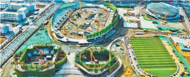 建设者们在张掖奥体中心场馆建设现场紧张忙碌