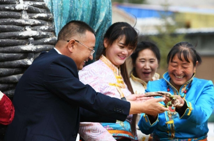 9月23日,甘肃省武威市天祝藏族自治县抓喜秀龙镇举办“庆丰收·促和美”中国农民丰收节活动。当地各族群众身着盛装欢聚一堂、载歌载舞,“晒”特产,话“丰”景,欢庆第六个中国农民丰收节。