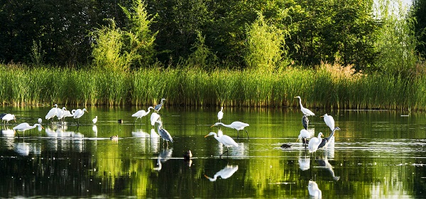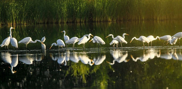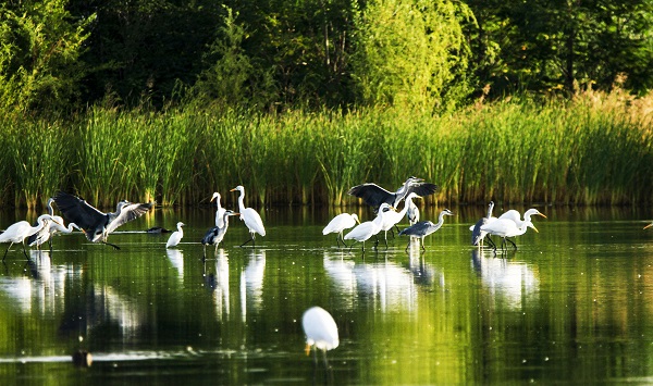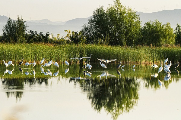 2023年9月25日,一群白鹭在甘肃张掖国家湿地公园翩翩起舞。当日清晨,在甘肃张掖国家湿地公园西口的湖水中,一群白鹭在水面上栖息、觅食,不时跳跃飞舞。洁白的羽毛,灵动的身影,在晨光的映照下充满诗情画意。(陈礼 摄)