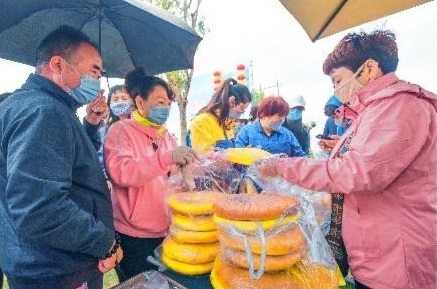 9月24日,嘉峪关市2023年中国农民丰收节暨峪泉镇第四届锅盔文化节,在嘉峪关·关城里景区开幕,极具特色的“峪泉锅盔”、喜庆欢腾的农民歌舞、琳琅满目的农特产品吸引了众多市民游客打卡。图为市民品尝购买“峪泉锅盔”。融媒体中心记者 李巍 摄
