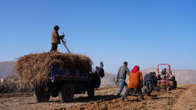 初冬时节,永靖县小岭乡的中药材黄芪采挖陆续接近尾声,黄芪种植户租用采挖机、雇人工,趁着晴好天气加紧采收、装运、交售黄芪。永靖县农发集团组织工作人员现场验货、评估价格、组织人员装运,助力群众持续增产增收。