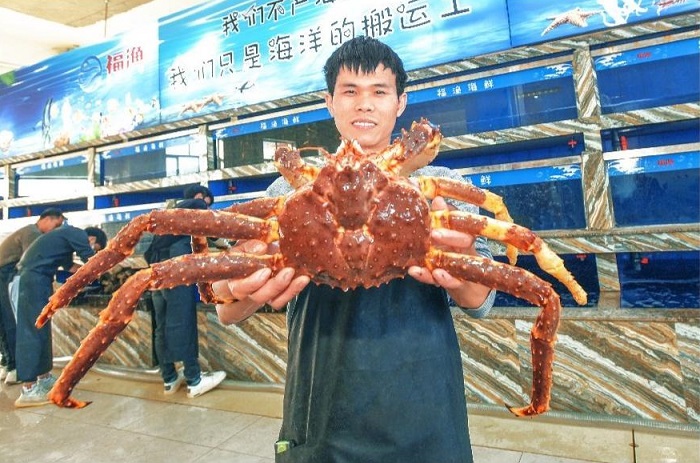 这是工作人员展示通过冷链运输来的帝王蟹。融媒体中心记者 李巍 摄