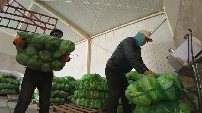 11月25日清晨,在金昌市食品有限责任公司储备仓库旁,搬运工人挥汗如雨,将采购的蔬菜与肉类从卡车搬运到冷库里。全市2023-2024年度冬春蔬菜储备工作正在有序地进行中。