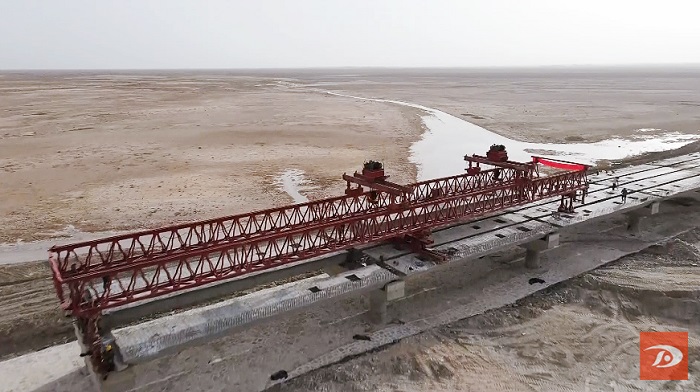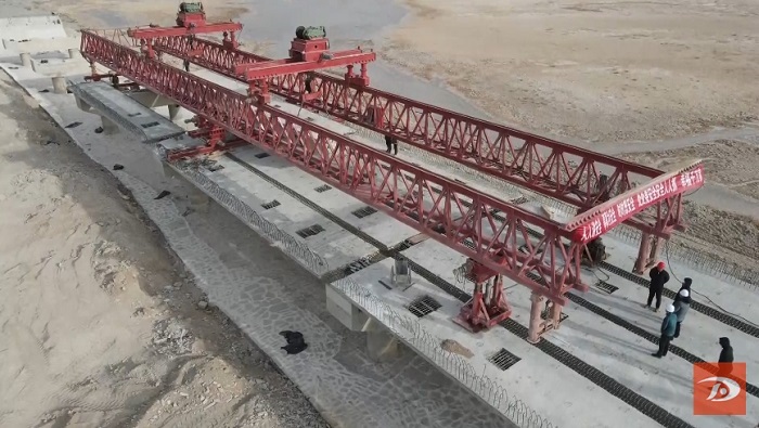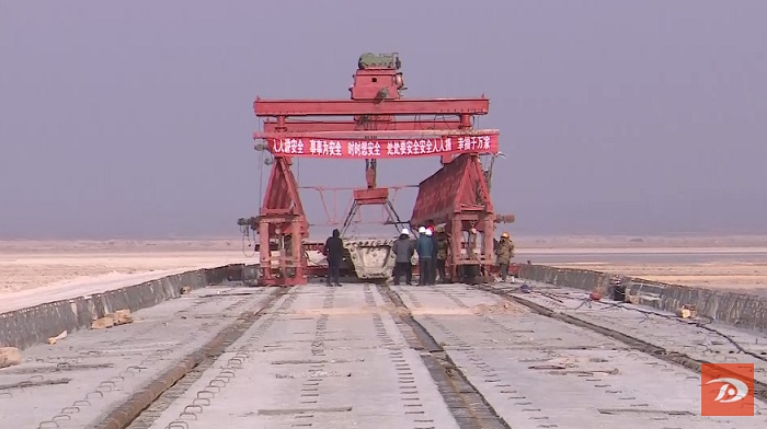 日前,该项目建设现场热火朝天,工人们顶着大风、冒着严寒进行箱梁吊装作业,全力推进重要控制节点哈拉诺尔湖大桥建设。大桥位于哈拉诺尔湖中,桥梁跨径为10×20米大桥,全长206米,现已完成桩基浇筑、箱梁吊装,占大桥工程量的85%。