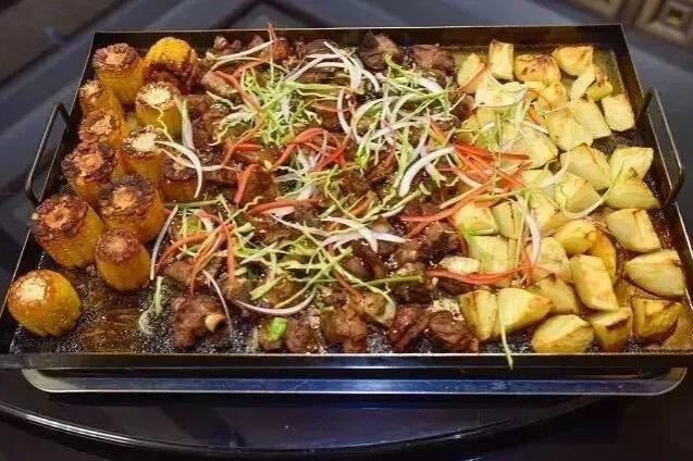 一大盘烤羊肉端上来,整齐地排放在烤盘上,烤得嗞嗞冒油,烤玉米、烤土豆、烤南瓜搭配吃起来不油腻,还有农家美食的特色在其中,真让人垂涎欲滴,会让您瞬间感觉,人生在世不过吃喝二字。