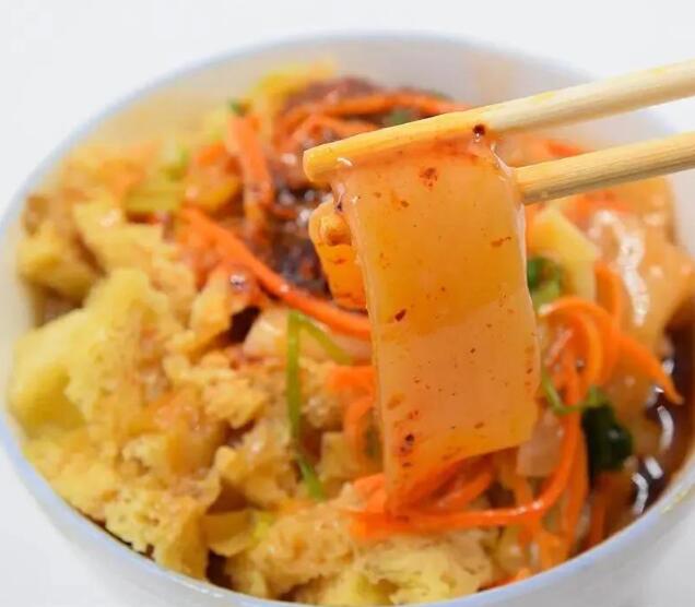 面皮子是永昌的一种特色面点食品,用优质面粉精制而成,色泽晶莹黄亮,透明如玉,切成长条状或块状,根据需要配以醋汁、蒜泥、辣椒酱、黄瓜、胡萝卜丝等调味品即成,口感清凉酸辣。