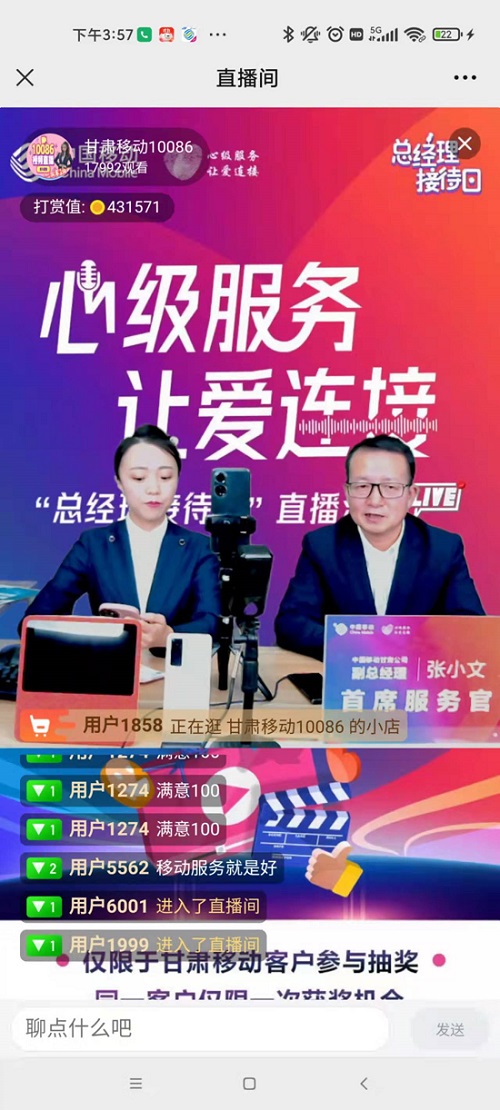 12月15日下午15:00,甘肃移动12月“总经理接待日”活动在中国移动APP直播专区正式开播,甘肃移动副总经理张小文作为全省两千万用户的首席服务官来到了直播间,与广大用户和粉丝欢聚一堂,谈天说地。