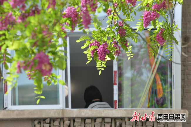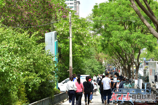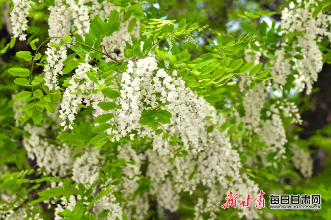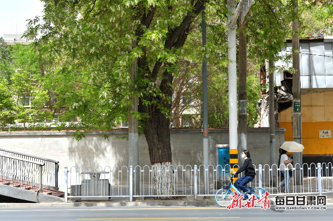 暮春时节,生长在兰州各个街道路旁的一棵棵槐树开满了白色、紫色的槐花,满树娇美的花朵随风摇曳,成了春日绿意中兰州街头一道迷人的风景线。