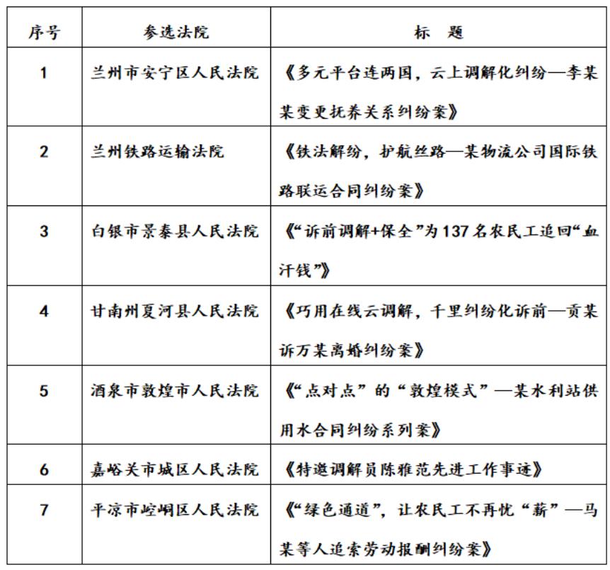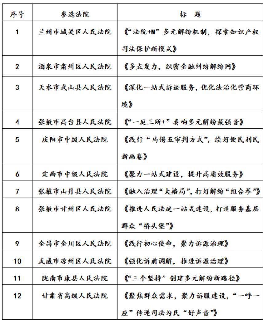 为发挥典型经验和优秀案例的示范、引领作用,更加生动地讲好全省法院立案诉服部门助力优化法治化营商环境故事、展现一站式建设工作成果、推动“人人都是营商环境、事事都关营商环境、案案都涉营商环境”落地落实,经全省三级法院自行申报,省法院立案一庭、宣传处及网络处综合审查评选,同时结合参评法院一站式建设质效评估得分及社会公众网络投票结果,坚持“优中选优”,确定将兰州市城关区人民法院等12家法院的经验做法及兰州市安宁区人民法院等7家法院的案例作为全省法院助力优化营商环境暨一站式多元纠纷解决和诉讼服务体系建设典型经验和优秀案例向社会发布,具体名单如下: