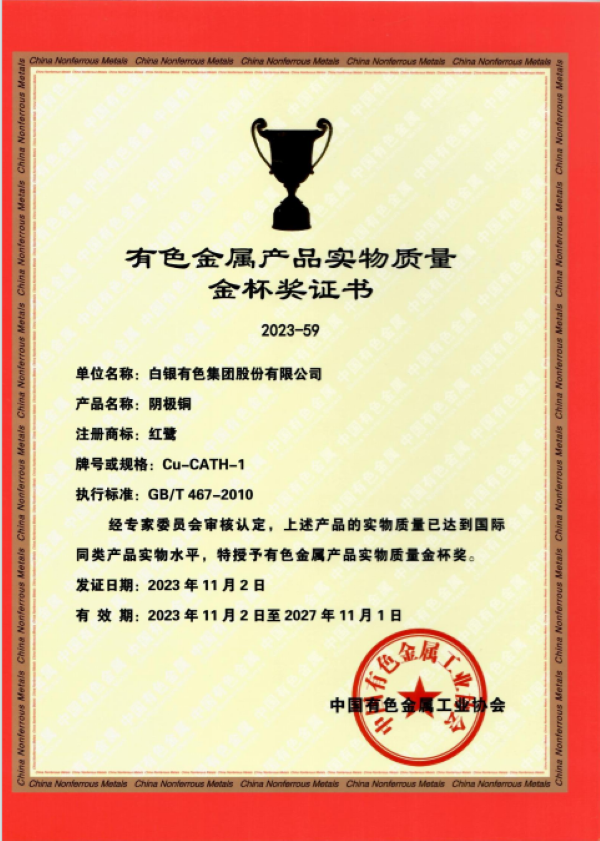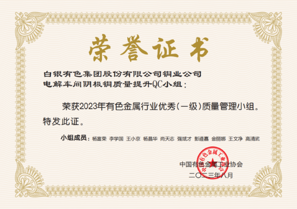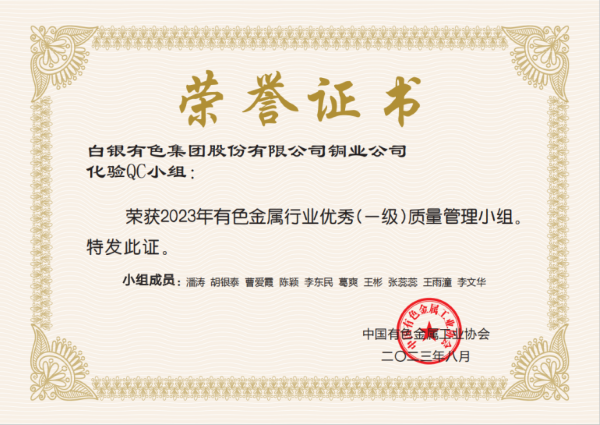 在产品实物质量认定会上,铜业公司选送的电解车间阴极铜质量提升QC小组“提高A级铜品级率”和化验QC小组“提高原子荧光测定硫酸中汞含量的准确度”成果分别获得“2023年度有色金属行业优秀质量管理小组(一级)”荣誉证书,采样站QC小组“降低手持X荧光分析结果误差”成果获得“2023年度有色金属行业优秀质量管理小组(二级)”荣誉证书。铜业公司阴极铜产品获得“2022—2023年度有色金属行业实物质量认定金杯奖”,这也是阴极铜产品自2009年首次获得有色金属行业实物质量认定金杯奖后第四次通过复评。