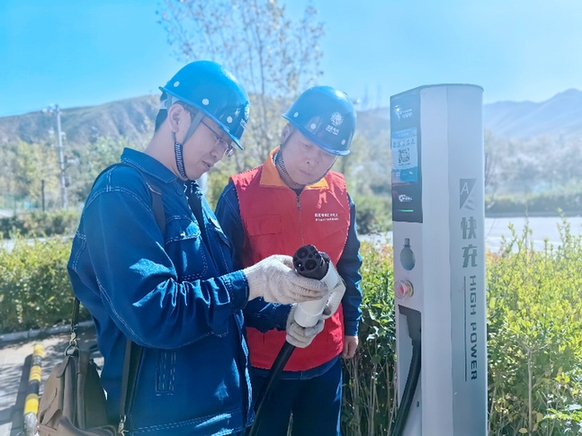 9月27日,国网武威供电公司天祝县供电公司员工张文录、林平在天祝县城充电站开展安全用电检查,保障站内用电可靠,客户充电无忧。王振娟 摄