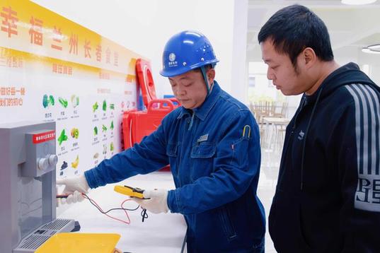 国网兰州供电公司员工在枣林西社区查看长者食堂用电情况。李小东摄