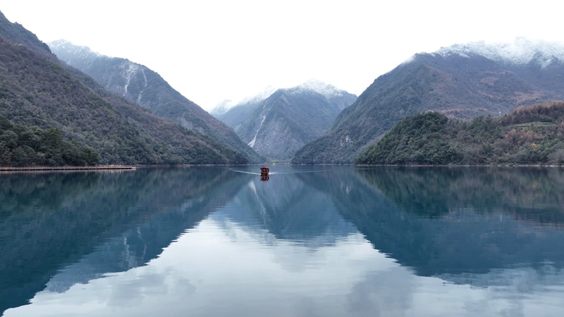 初冬时节,甘肃省陇南市文县天池清澈如镜,犹如一颗蓝宝石。远处雪峰皑皑,群峰倒影,随波微动,让人流连忘返。