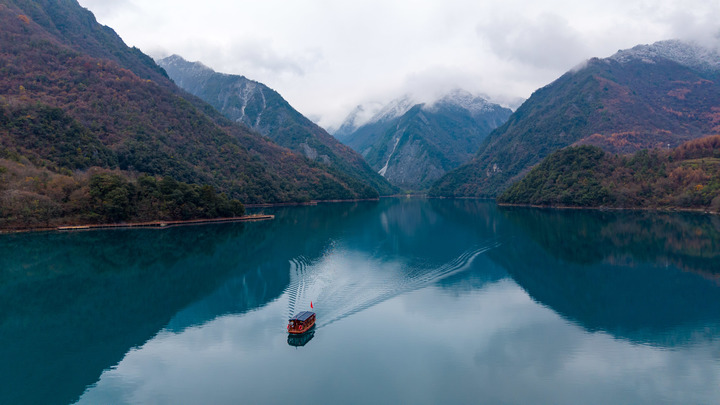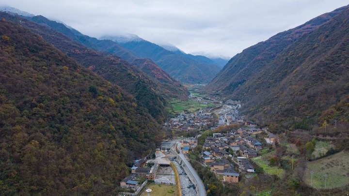 初冬,甘肃省陇南市宕昌县还没褪去深秋的彩衣。在官鹅沟国家5A级景区,红叶和绿草点缀着山川,如飘带般的河流缠绕在山间,倒映着远处的雪山。