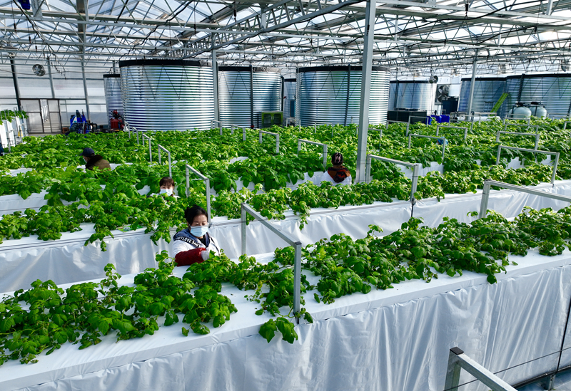 初冬时节,甘肃省陇南市西和县现代农业示范园马铃薯脱毒种薯雾培联动温室大棚内,工人正忙着管护、采摘成熟的薯种。