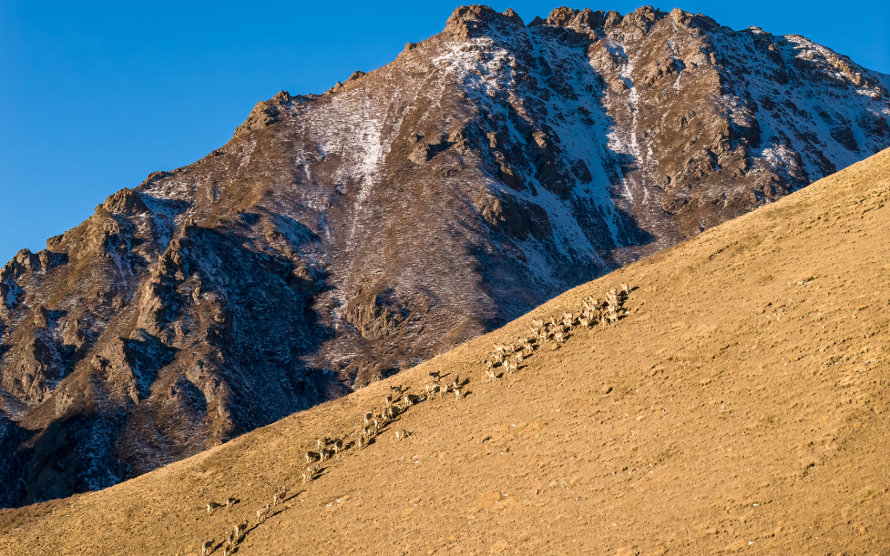 【“飞阅”中国】甘肃:岩羊“列阵”白石崖 高原精灵映晨光