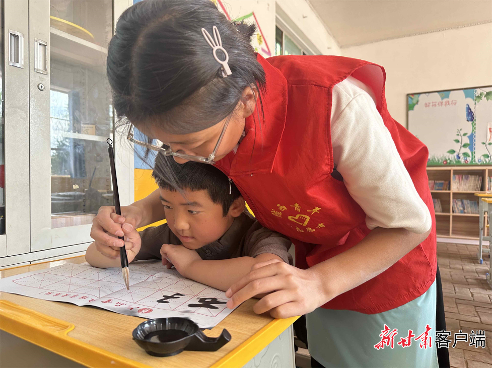 9岁的石子航在大学生志愿者的指导下练习书法。