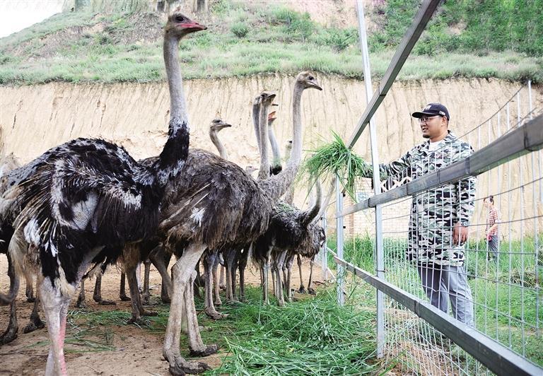 在鸵鸟养殖基地,只见一只只体型健硕、脖子细长的鸵鸟正怡然自得地在围栏里悠闲踱步。见养殖户投来青草等食物,鸵鸟们便迈开大长腿,迅速奔来,瞬间就把食物一抢而空。陶超养殖鸵鸟,是外出创业历经挫折后的新尝试。“鸵鸟食性杂,不挑食,青草、树叶、嫩树枝都吃,每天只需喂两次饲料。”陶超说,3年前,他从庆阳周边县区引进了15只非洲和澳大利亚种鸟,20只五六个月大的幼鸵鸟,并花2万多元从天津购买了3台孵化器,孵化率由刚开始的不到50%增加到现在的90%,累计孵化300只幼鸵鸟。经过一段时间喂养后,其余已宰杀出售,目前基地里养殖近80只。
