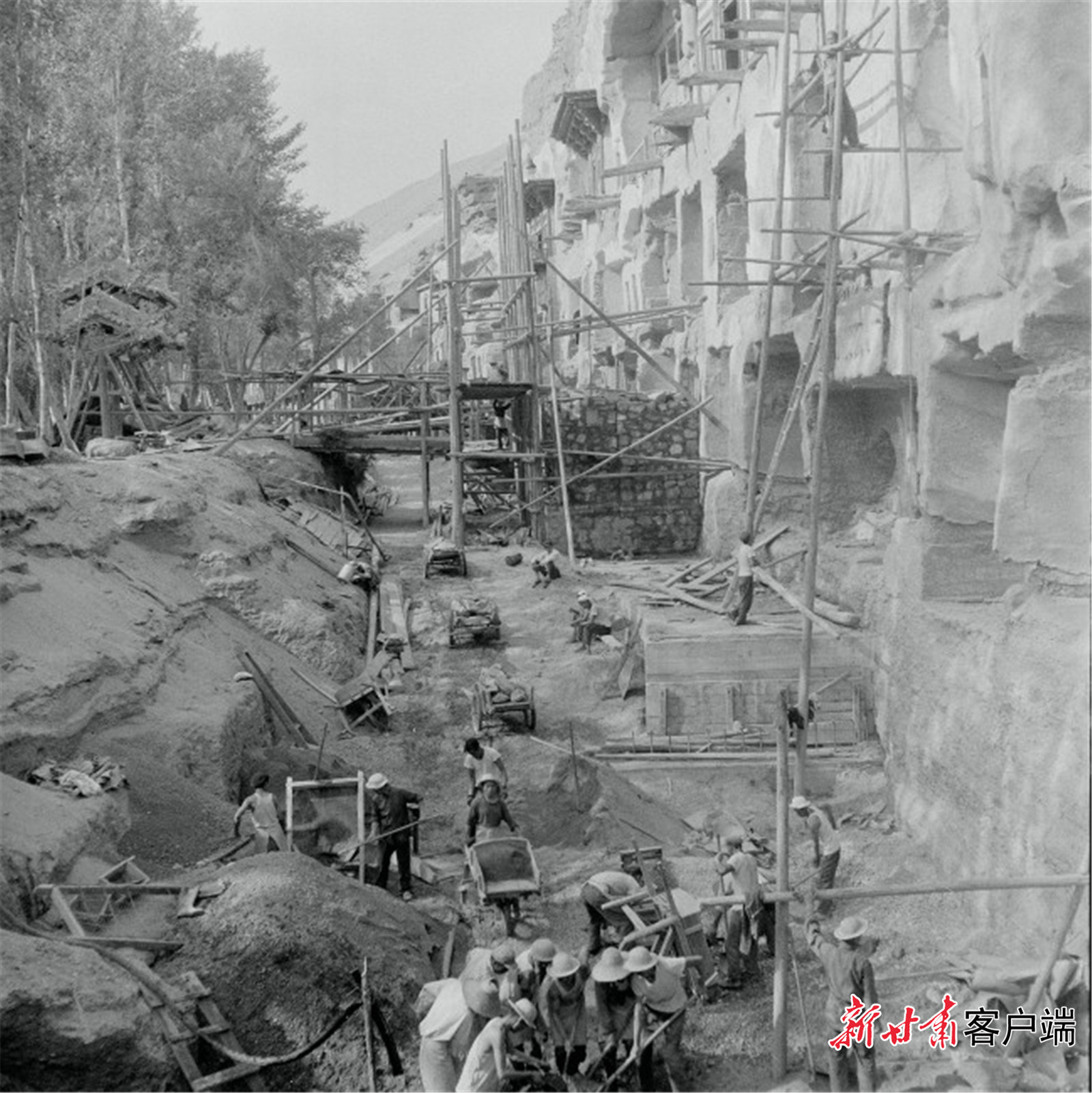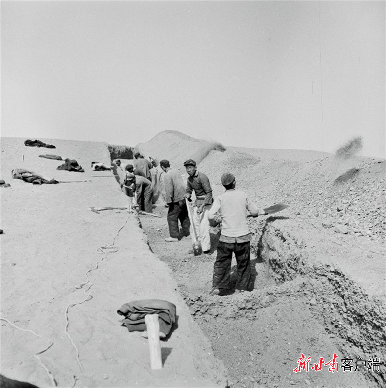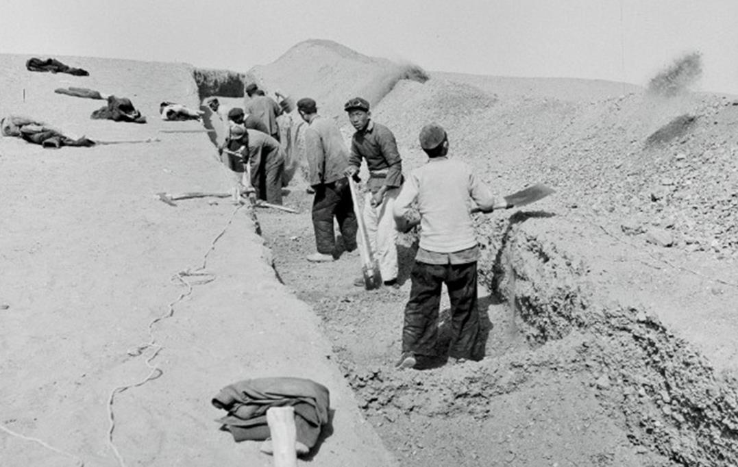 1955年,敦煌文物研究所职工在莫高窟崖顶挖防沙渠。