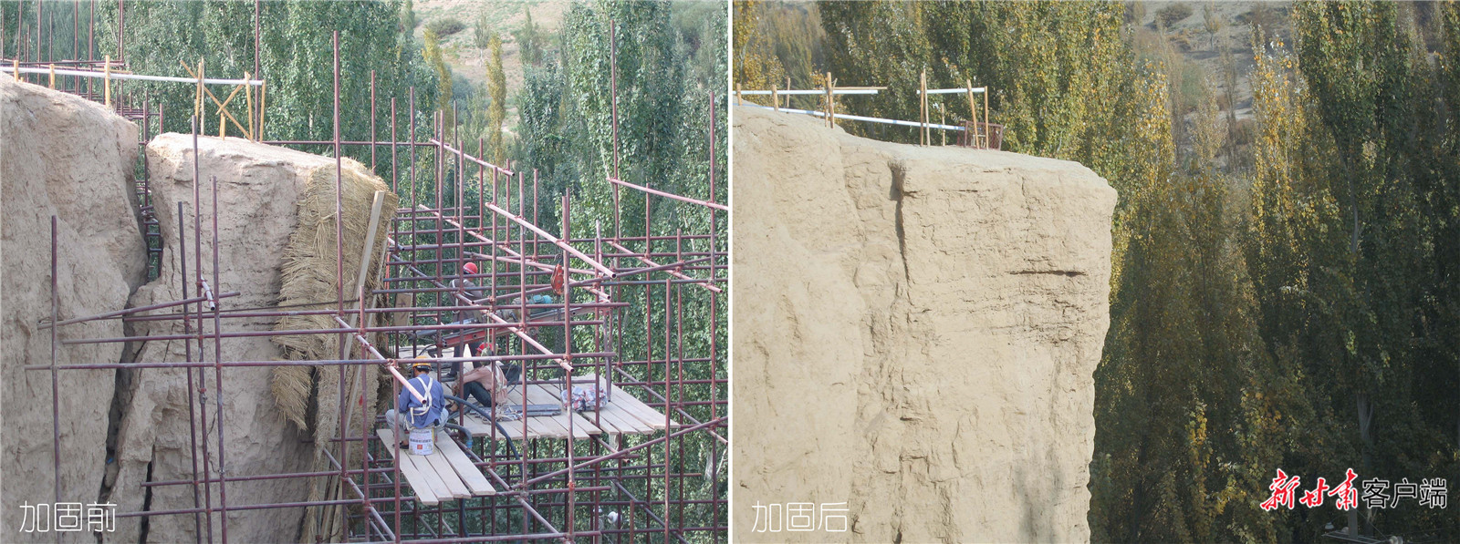 交河故城崖体加固前后效果对比。
