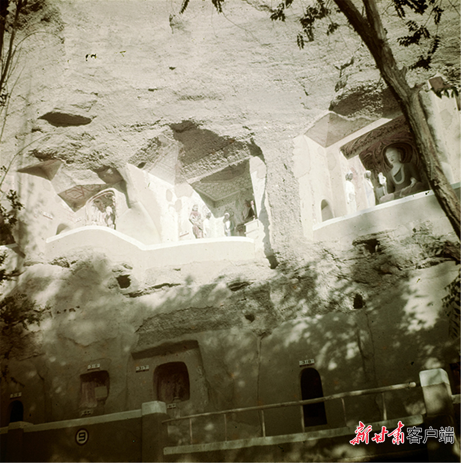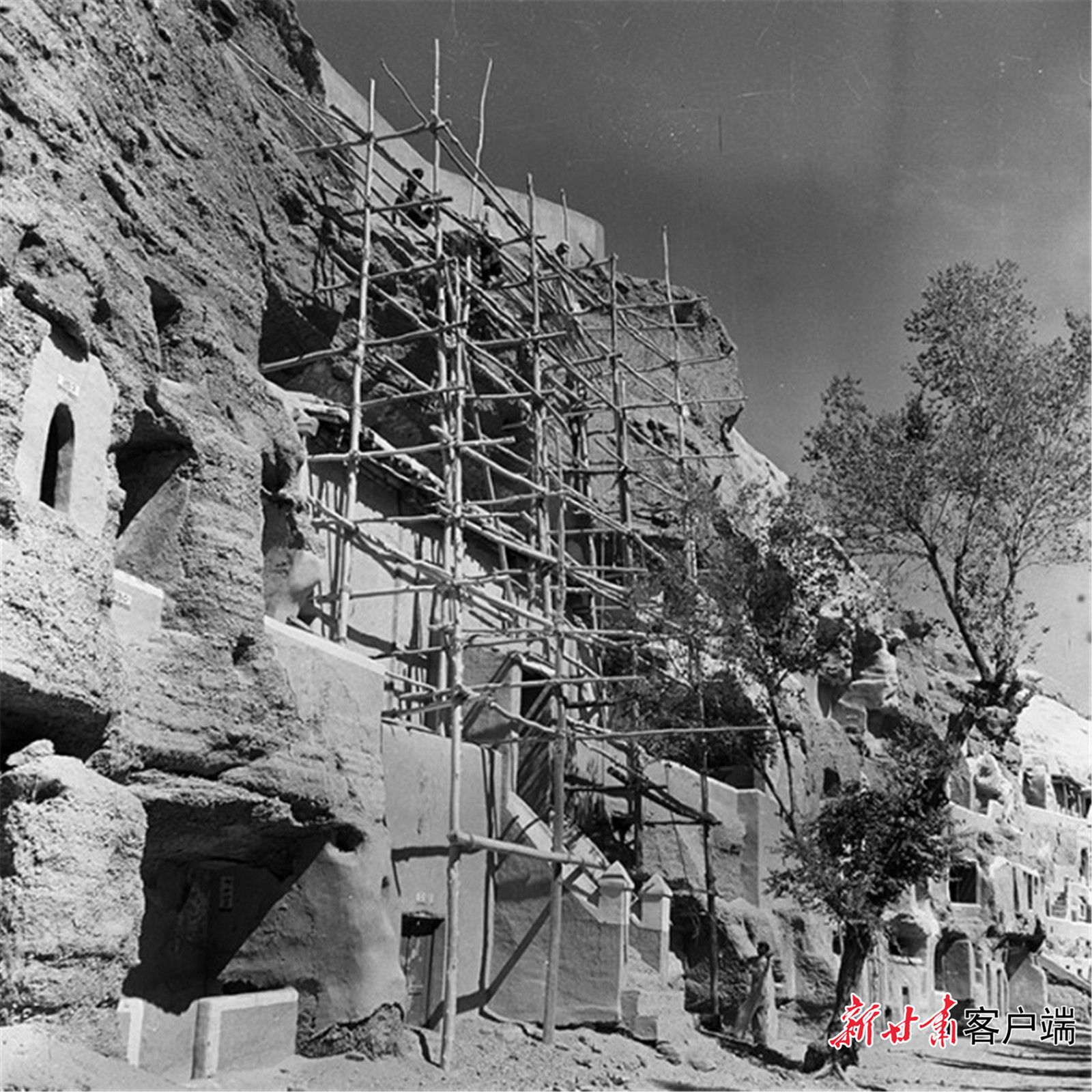 1948年,经过敦煌艺术研究所初步加固后莫高窟部分洞窟外观。