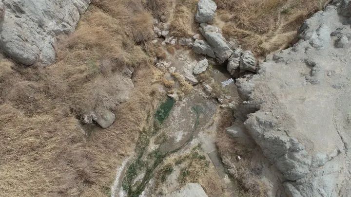 这是2023年4月20日拍摄的悬泉置遗址附近的悬泉景观(无人机照片)。甘肃省敦煌市悬泉置遗址保护所供图